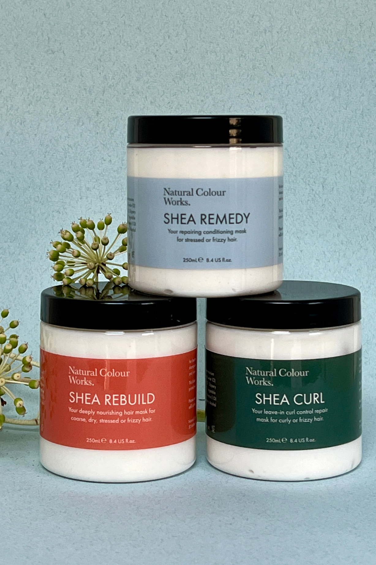 Handcrafted in our London salon, our Shea Collection offers three tailored treatments. Shea Remedy adds lightweight hydration for fine or perimenopausal hair. Shea Rebuild delivers deep nourishment for coarse textures, while Shea Curl, a leave-in formula, enhances and styles natural curls effortlessly.